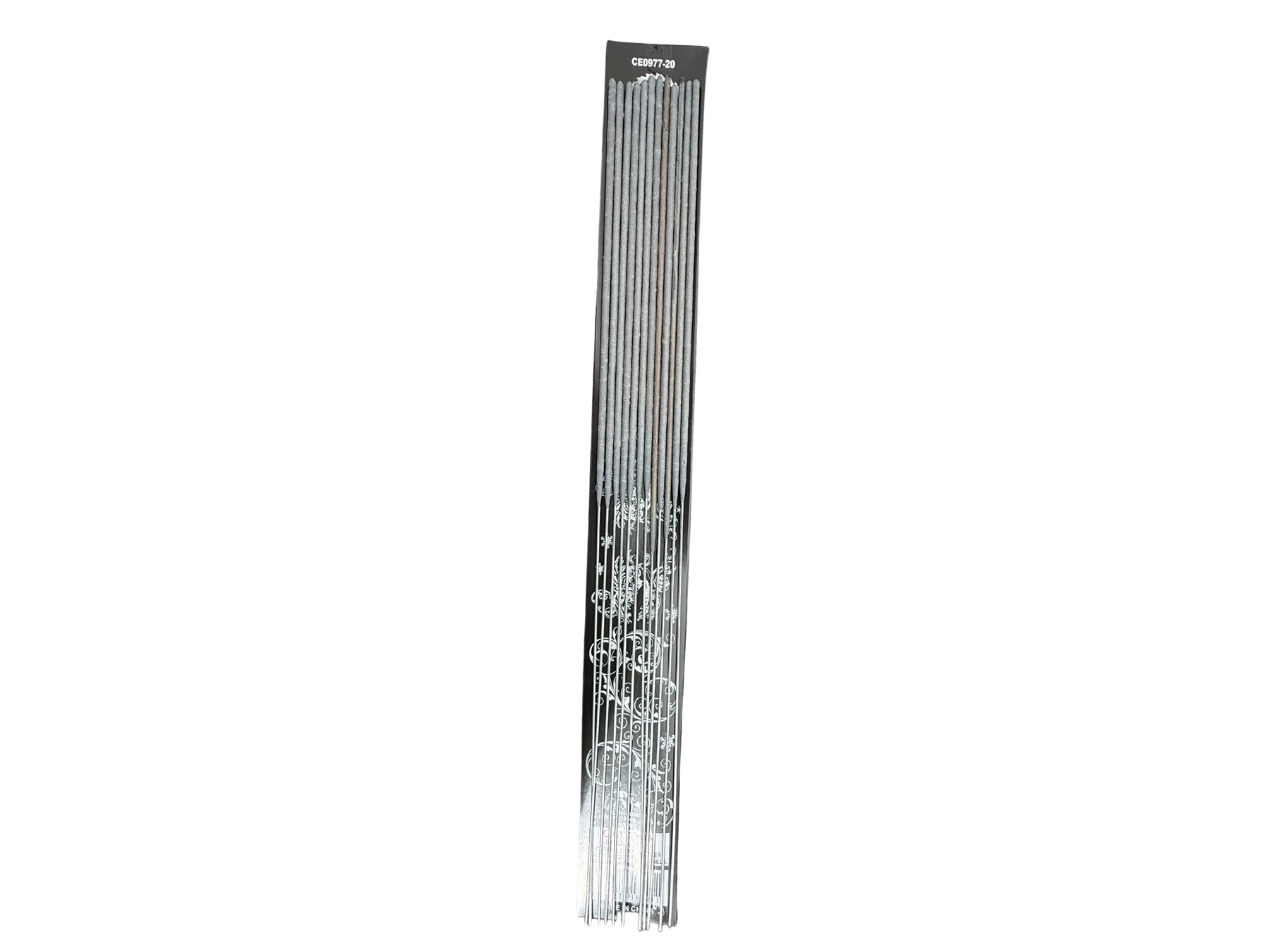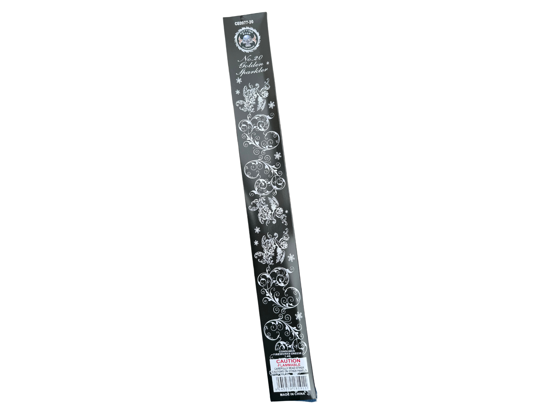 20″ gold sparklers with a bamboo wood handle. Each sparkler emits color sparks for approximately 30 seconds. Gold sparklers emit less smoke and are less flare like. Bamboo stick will not get hot like metal sparklers making it the safest of all sparklers.